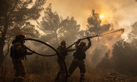 Firefighters battle a wildfire in Agia Sotira, as Greece endures its hottest July in half a century. Photograph: Xinhua/Shutterstock